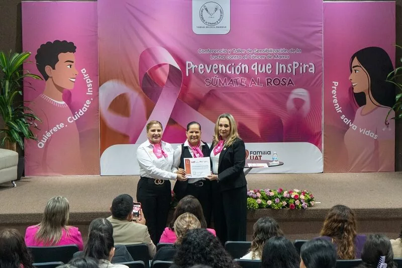 Ciudad Victoria, Tamaulipas.-La Universidad Autónoma de Tamaulipas, a través de Familia UAT, llevó a cabo la conferencia y taller de sensibilización de la lucha contra el cáncer de mama “Prevención que inspira, súmate al rosa”, con el propósito de promover la conciencia sobre la detección oportuna y fortalecer la cultura de la prevención en la comunidad universitaria.