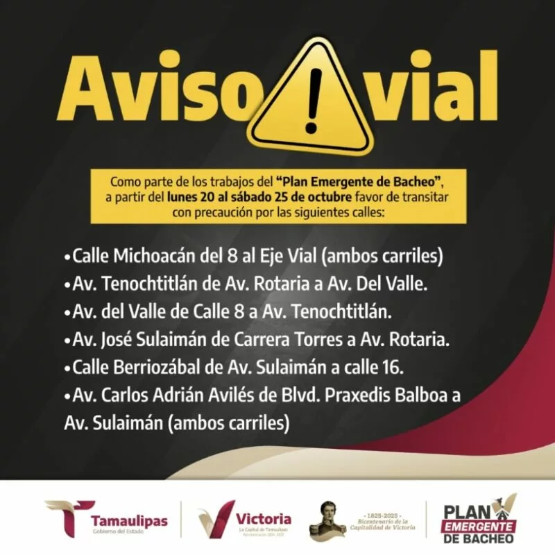 Cd. Victoria, Tamaulipas. – Para que ciudadanos y conductores tomen previsión en sus rutas de traslado a centros laborales y educativos, el gobierno de Victoria informa que este lunes el Programa Emergente de Bacheo continuará en distintos sectores de la ciudad.