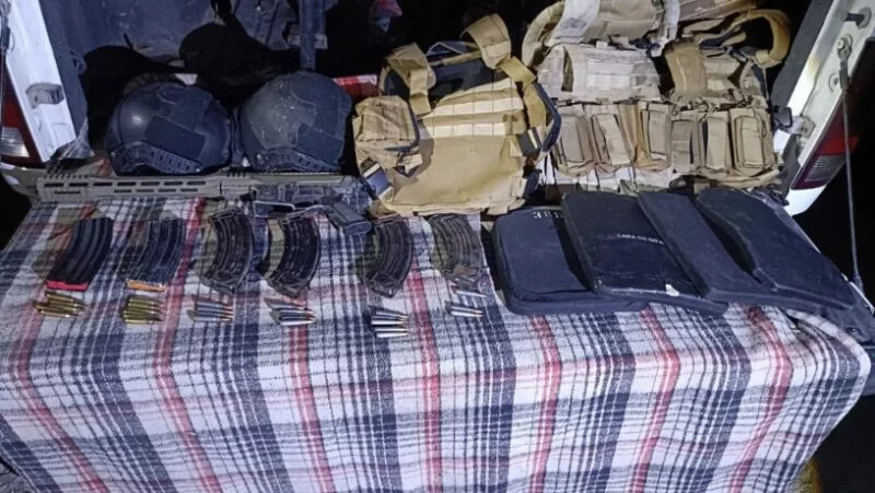 Matamoros, Tamaulipas.– Elementos de la Guardia Estatal aseguraron un arma larga, cargadores y equipo táctico en un predio del ejido Barranquitas.