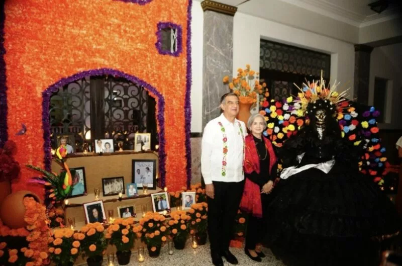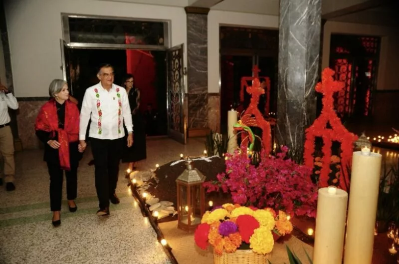 Ciudad Victoria, Tamaulipas.- En un ambiente impregnado por el aroma de la flor de cempasúchil, el pan de muerto y las luces de las velas, el gobernador Américo Villarreal Anaya y la presidenta del Sistema DIF Estatal, María de Villarreal presidieron la premiación del concurso estatal de catrinas y catrines “Almas Tamaulipecas” y la muestra del altar monumental del Día de Muertos en las escalinatas de Palacio de Gobierno .