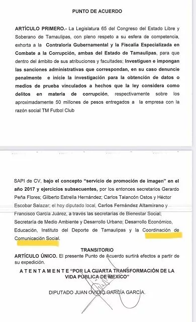 Cabe recordar que, este caso de corrupción del gobierno de Cabeza de Vaca, fue ventilado en las conferencias mañaneras del ex presidente López Obrador, del 30 de junio y el 9 de diciembre de 2022, y llevado al Congreso del Estado en las sesiones del 11 de mayo de 2022 y 5 de enero de 2023, por la bancada de Morena, derivando en un exhorto de la 65 Legislatura a la entontes Contraloría Gubernamental y a la Fiscalía Especializada en Combate a la Corrupción, para llegar a las últimas consecuencias en contra de quienes cometieron este desfalco.