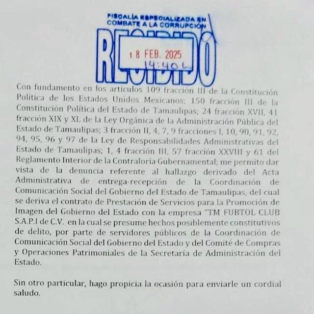 Ciudad Victoria, Tamaulipas.-La Fiscalía Anticorrupción de Tamaulipas investiga al ex gobernador Francisco García Cabeza de Vaca, por el desvío de 560 millones de pesos y asignación de contratos ilegales a través de la Coordinación de Comunicación Social, siendo el más favorecido por esto, el club de fútbol Tampico-Madero.