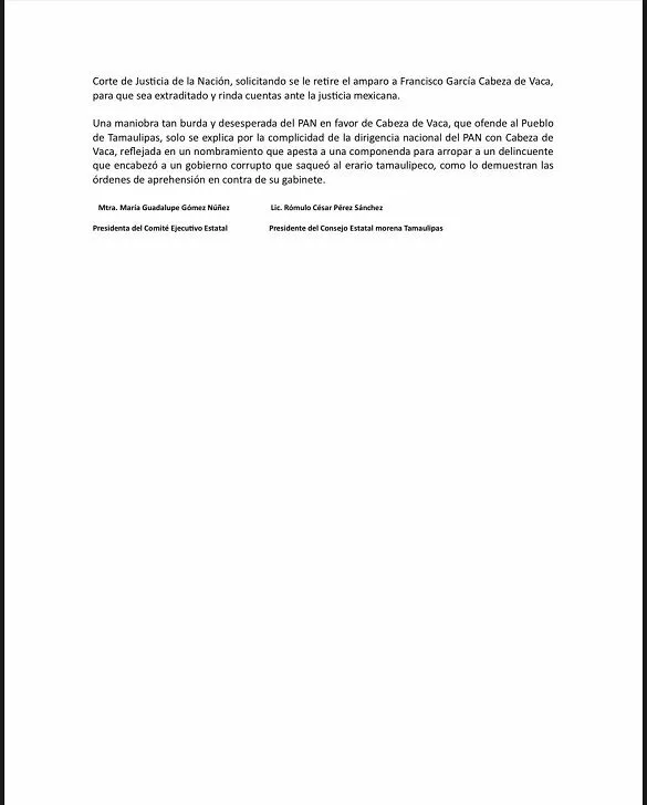 Rechazamos enérgicamente la designación de la dirigencia nacional del PAN, aplaudida por el corrupto panismo tamaulipeco que obedece las instrucciones del ex gobernador, pues la realiza justo cuando acabamos de entregar más de 100 mil firmas de tamaulipecas y tamaulipecos a la Suprema Corte de Justicia de la Nación, solicitando se le retire el amparo a Francisco García Cabeza de Vaca, para que sea extraditado y rinda cuentas ante la justicia mexicana.