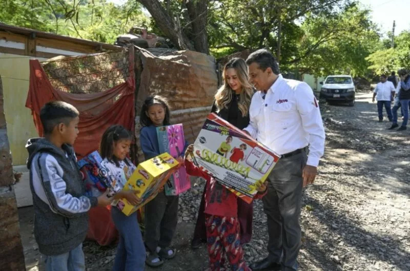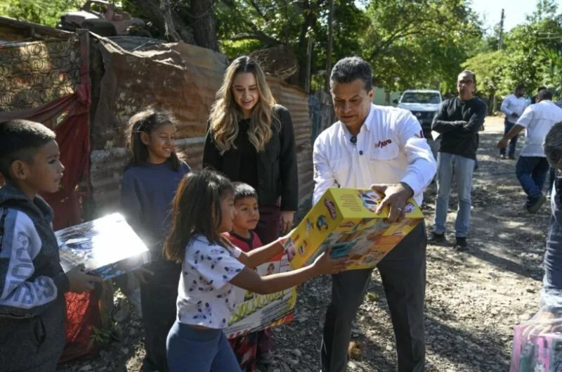 Cd. Victoria, Tamaulipas.- Cómo parte de la campaña “Ayudemos a Santa 2025” el alcalde de Victoria Lalo Gattás y su esposa Lucy de Gattás, presidenta del Sistema DIF Municipal, recorrieron hogares de las colonias Rosalinda Guerrero y Constitución del 17 para obsequiar juguetes y convivir con familias previo al festejo de la navidad.