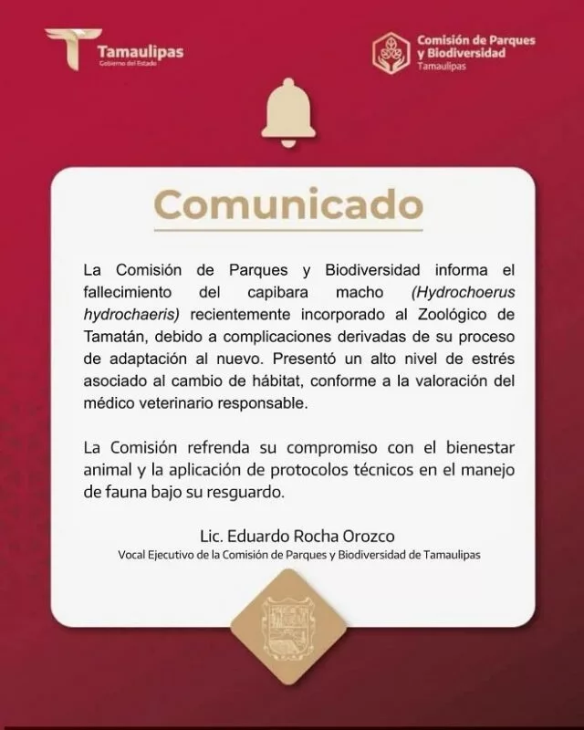 La pérdida resulta especialmente sensible dado que el Zoológico de Tamatán había anunciado con entusiasmo la llegada de estos nuevos inquilinos hace apenas dos días. Se trataba de una pareja de capibaras procedentes del estado de Nuevo León, integrada al programa de manejo de fauna del zoológico local.