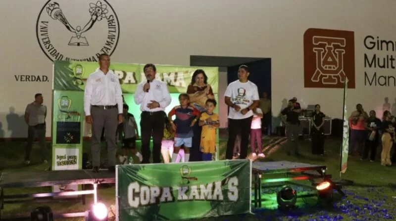 Ciudad Mante, Tamaulipas.-En el marco del fortalecimiento de la vinculación social y el impulso a la formación integral de la niñez y juventud, el rector de la Universidad Autónoma de Tamaulipas (UAT), Dámaso Anaya Alvarado, inauguró la Copa Kama’s de futbol la noche de este viernes 17 de abril en las instalaciones del Gimnasio Multidisciplinario Mante, espacio universitario que fungió como sede del evento.